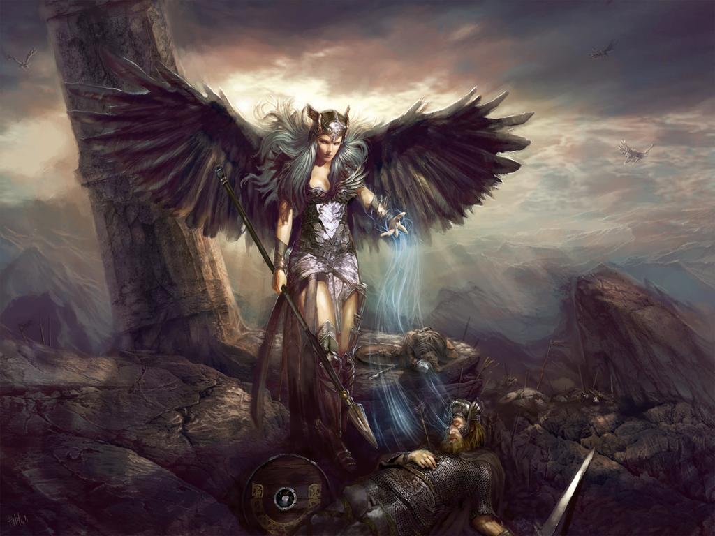 Valkyrie (“Choosers of the Battle-slain”; Old Norse valkyrja, pl. valkyrjar): The valkyries are representative of warfare, but are also magicians, guardians, female lovers of heroes, bird-women, and keepers of knowledge. They are concerned with fertility and fecundity and have many points in common with the Dises (deities), the Norns (the Germanic Fates), and the fylgjur (personal tutelary spirits).