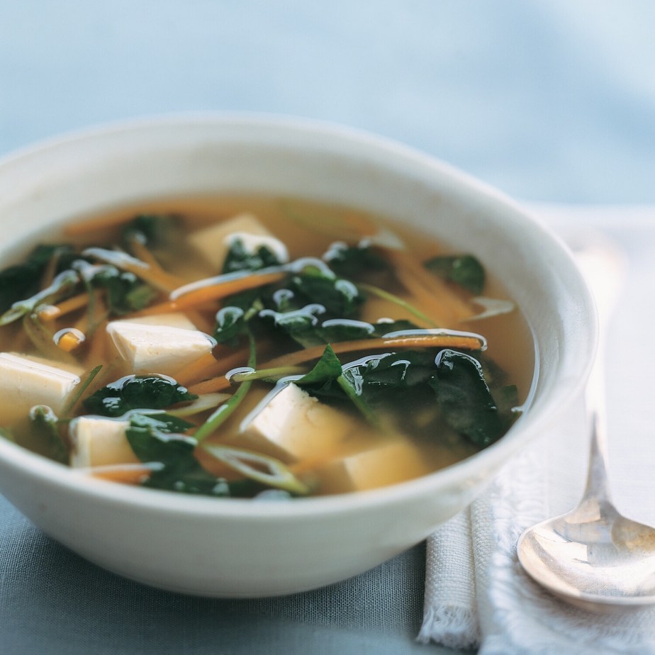 Bring dashi to a simmer over medium heat, do not boil. Wrap tofu in double layer of paper towels. Place tofu between two plates and place 28 ounce can on top for twenty minutes. Whisk in miso paste. Cut tofu into small squares. Add mushrooms. Cook for 10 minutes. Add tofu. Cook for 10-15 minutes more. Serve immediately.