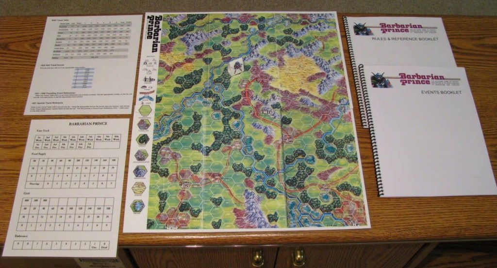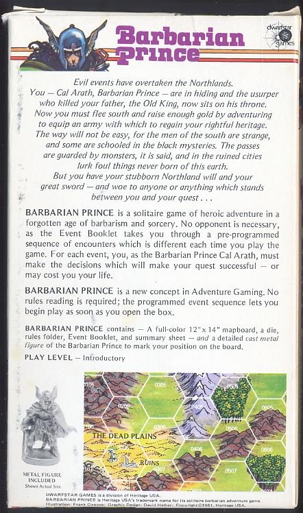 BARBARIAN PRINCE contains — A full-color 12″x 14″ mapboard, a die, rules folder, Event Booklet, and summary sheet — and a detailed cast metal figure of the Barbarian Prince to mark your position on the board.