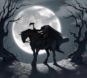 The Dullahan carries a whip made from a human’s spine. Sometimes pulls wagon which is adorned with funeral objects (e.g., candles in skulls to light the way, the spokes of the wheels are made from thigh bones, the wagon’s covering made from a worm-chewed pall or dried human skin). When the Dullahan stops riding, that is where a person is due to die and when a Dullahan calls out the person’s name, the person immediately perishes.