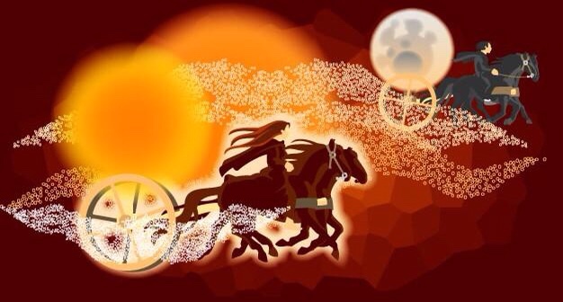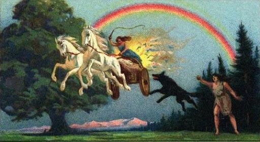 The Vikings seem to have had a different view, though. In Norse belief, the sun was not some powerful masculine god. Instead, the sun was a woman (a goddess presumably, but never expressly called that). This woman, Sunna or Sól, drives her chariot lit from the sparks of Muspellsheim (the land of fire) across the sky (i.e. Sunna’s Day or Sun Day). Sól’s horses are called Arvak and Alsvinn, and they are cooled by bellows under their shoulders. Sól is continuously pursued by a giant wolf named Skoll, who is a relative of Fenrir.