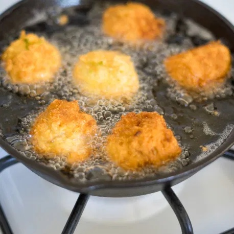 Fill a deep-sided cast-iron skillet or Dutch oven with 1 inch of oil. Place over medium-high heat, and bring the oil to 375 degrees. Monitor and keep the temperature between 350 and 375 degrees while you are frying.