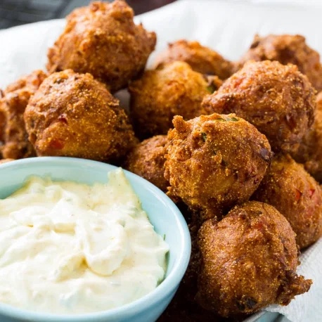 In a large bowl, whisk all the ingredients together. Working in batches, drop a tablespoons into the oil and fry until golden and crisp, usually 3 to 4 minutes, turning occasionally. Remove with a slotted spoon and drain on paper towels.