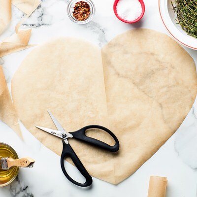 Heat oven to 400°. Measure four 24 inch long sheets of parchment.Fold each sheet in half, and starting from the folded side, cut a large half-heart shape.