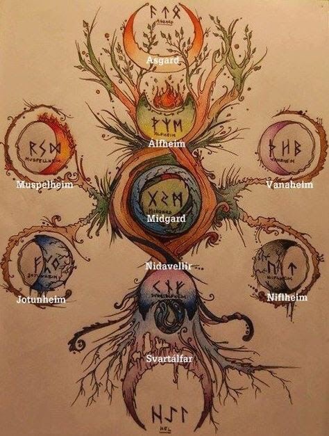 Living beneath its three roots are men, frost giants, and the dead in Hel’s realm. According to one tradition, one of its roots leads to the world of the Æsir in the sky. This is where the springs of Urðr (a Norn), Mímir (a giant), and Hvergelmir (the source of all rivers) are located. The dragon Niðhöggr also lives here. The second root goes to Jötunheimr, the world of the giants, and the third to Niflheimr, the world of the dead.