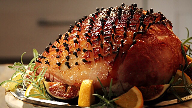soak figs, prunes and dried fruit in a good port while it cooks. Pour over ham and 1/2 hour more. Serve fruit and juice hot with ham.