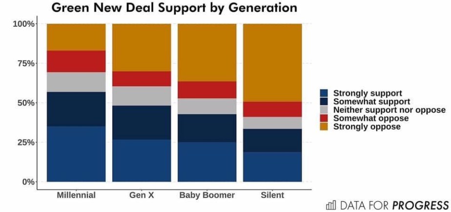 Research shows that age strongly predicts support for the Green New Deal, even controlling for several variables like party, ideology, and race. One wonders if this is because young people, unlike older generations, must contemplate living through the worst effects of climate change a few decades down the line.