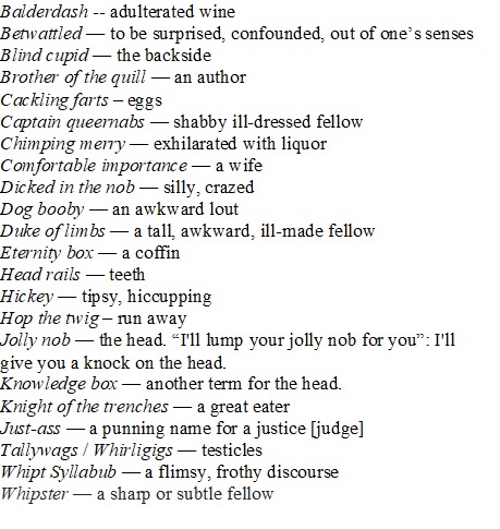 So, an “eternity box” is a coffin, to “hop the twig” is to run away & “balderdash” is adulterated wine. Enliven your vocabulary with this & much more 18th century slang, as recorded in Grose‘s Classical Dictionary of the Vulgar Tongue (1788):