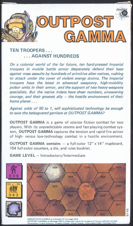 Outpost Gamma is a game of science fiction combat for two players. With its unpredictable storms and fast-playing combat system, Outpost Gamma captures the tension and rapid-fire action of high versus low-technology combat in a hostile environment.