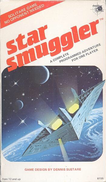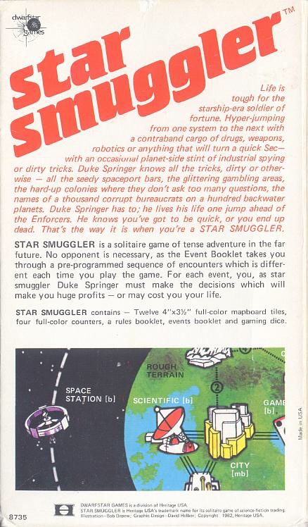 Star Smuggler is a solitaire game of tense adventure in the far future. No opponent is necessary, as the Event Booklet takes you through a pre-programmed sequence of encounters which is different each time you play the game. For each event, you, as star smuggler Duke Springer must make the decisions which will make you huge profits — or may cost you your life.