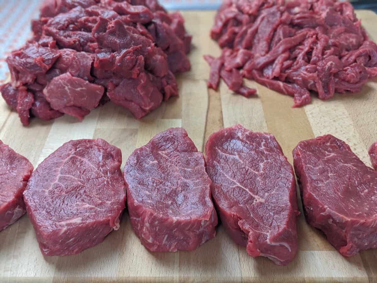 This is the muscle that is attached to the femur and has a fair bit of fat and gristle that needs to be removed. It also has a layer of connective tissue from where it connected to the femur. When trimmed, this muscle is great for lean ground beef.
