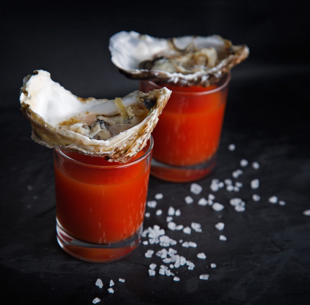 Spoon a bit of the mixture into the bottom of each shot glass. Add an oyster to each and top with the rest of the juice mixture. Serve right away.