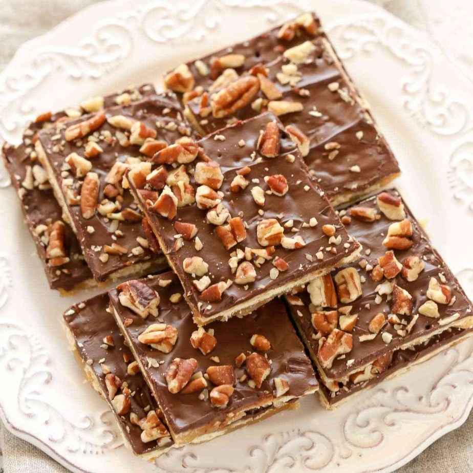 Sprinkle the pecans and the sea salt evenly over the top of the toffee. Leave to cool, then place in the refrigerator for about an hour for the chocolate to set. Break into pieces and store in an airtight container.