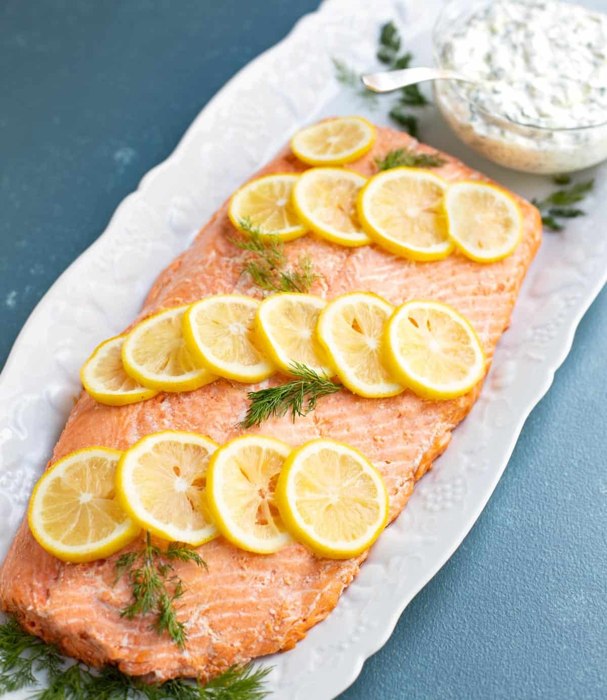 Serve garnished with the lemon and cucumber slices and the room temperature sauce alongside.