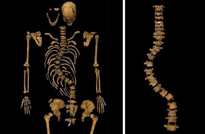 Here it is, showing his spinal scoliosis. His skull, which was bashed in; these are the wounds that killed him.