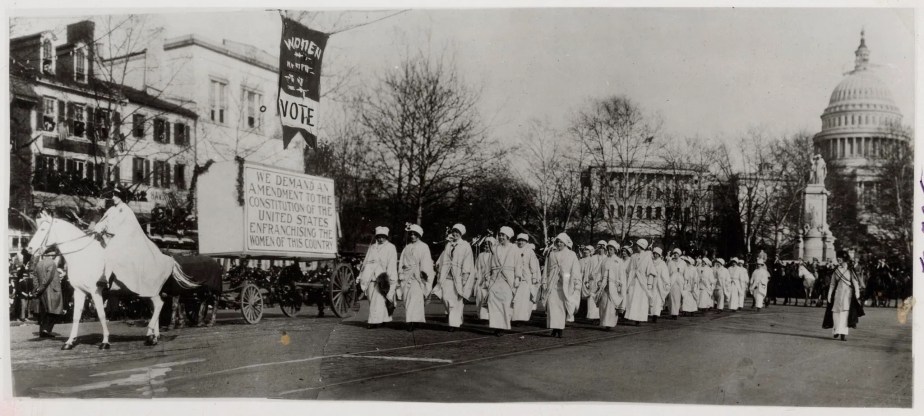 Here’s a photo of the procession, with the women all in white. They finally won the right to vote in 1920 when Tennessee became the last state needed to ratify the Nineteenth Amendment to the Constitution.