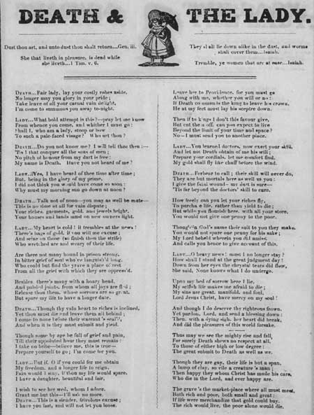 This ballad was printed by J. Deacon sometime between 1683 and 1700. It was printed as The Great Messenger of Mortality, or a Dialogue betwixt Death and a Lady. The The Dance of Death (conversations between Death and his victims) was a popular theme throughout the 14th and 15th centuries and again in the 18th century.