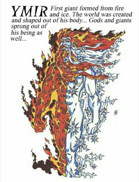 Ymir is the primordial giant and the progenitor of the race of frost giants. He was created from the melting ice of Niflheim, when it came in contact with the hot air from Muspell. From Ymir’s sleeping body the first giants sprang forth: one of his legs fathered a son on his other leg while from under his armpit a man and women grew out. The frost kept melting and from the drops the divine cow Audumla was created. From her udder flowed four rivers of milk, on which Ymir fed. The cow itself got nourishment by licking frost and salt from the ice.