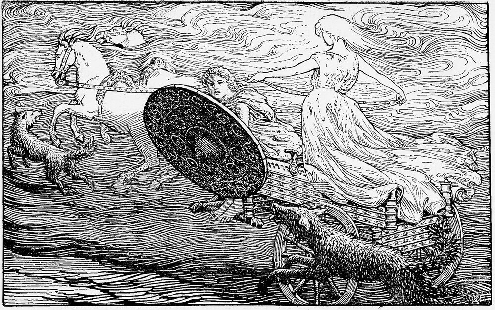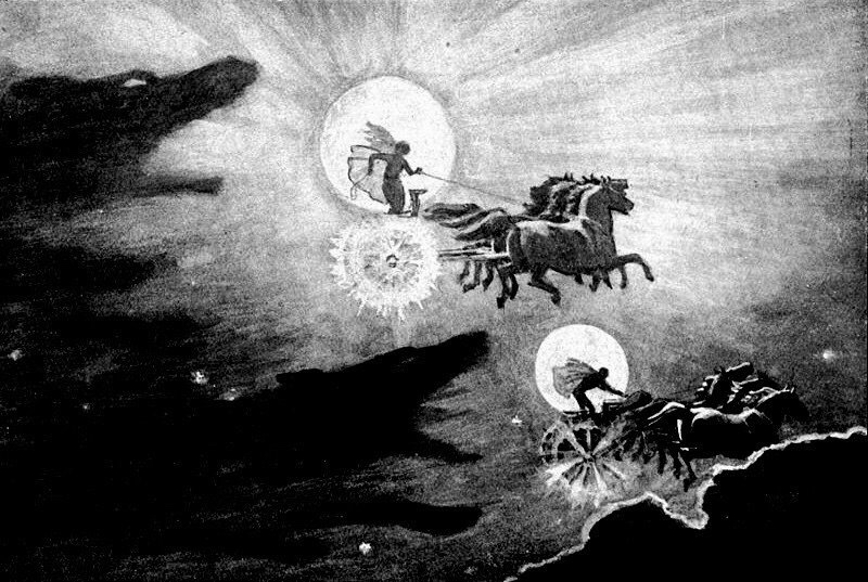 The Vikings seem to have had a different view, though. In Norse belief, the sun was not some powerful masculine god. Instead, the sun was a woman (a goddess presumably, but never expressly called that). This woman, Sunna or Sól, drives her chariot lit from the sparks of Muspellsheim (the land of fire) across the sky (i.e. Sunna’s Day or Sun Day). Sól’s horses are called Arvak and Alsvinn, and they are cooled by bellows under their shoulders. Sól is continuously pursued by a giant wolf named Skoll, who is a relative of Fenrir.