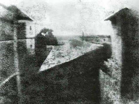 This is the oldest surviving camera photograph. It was taken in 1826 and took 8 hours of exposure. It was created by Nicéphore Niépce in 1826 or 1827 at Saint-Loup-de-Varennes, France, and shows parts of the buildings and surrounding countryside of his estate, Le Gras, as seen from a high window.