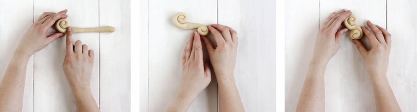 Roll each piece of dough into a long, skinny strip, about 12 inches long. Roll the left end of the dough up and clockwise until it reaches the middle, then roll the right end down and clockwise until it reaches the middle. Your dough should now look like a very tightly rolled S.